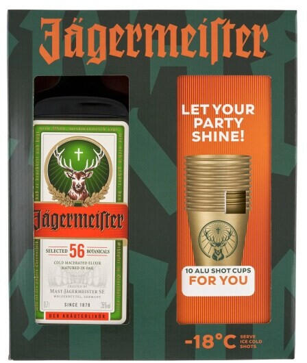 Jägermeister gyógynövénylikőr díszdobozban 10 db alu pohárral 35% 0,7 l