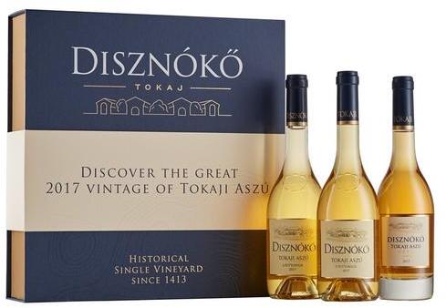 A díszcsomagolás tartalmaz 1-1 palackot az alábbi borokból: Disznókő Aszú 5 puttonyos 2017 (0,5l) Disznókő Aszú 6 puttonyos 2017 (0,5l) Disznókő V. P. T. S. Aszú 2017 (0,375l)