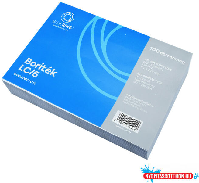 Boríték LC/5 öntapadó bélésnyomatlan 162×229mm, Bluering®, fehér 100db/csom LC5 méretű boríték, külső mérete: 162x229 mm. Az A4-es méretű levélpapírt félbehajtva lehet a borítékba tenni. A boríték a hosszanti oldalán záródik. 500 db boríték található a gyűjtődobozban. Alapanyag súlya: 80g Katalóguskód: 47691