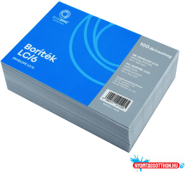 Boríték LC/6 szilikonos bélésnyomatlan 114x162mm, Bluering®, fehér 100db/csom LC6 méretű boríték. Külső mérete: 114x162 mm. A4-es méretű levélpapírt négybe hajtva lehet beletenni. A hosszanti oldalon záródik. 1000 db boríték található a gyűjtődobozban. Alapanyag súlya: 70g Katalóguskód: 47688