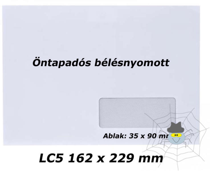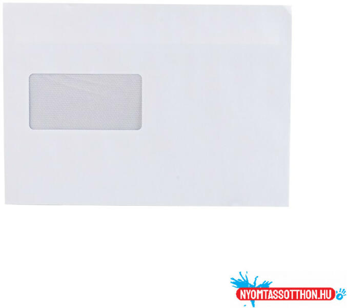 anyaga: fehér ofszet méret: 114×229 mm gépitöltésra alkalmas a boríték oldalsó ragasztása kívülre hajló csomagolási egység: 1000 db ablak mérete: 35x90 mm ablak elhelyezkedése: jobbról 28 mm alulról 20 mm