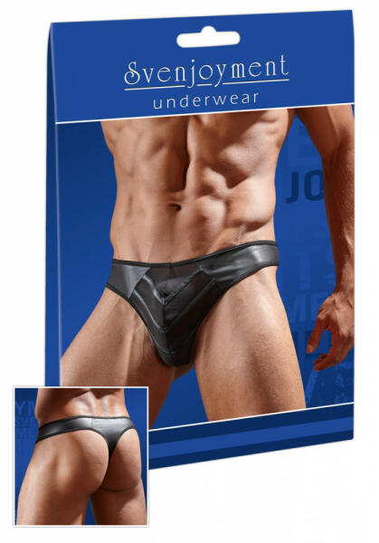 A Svenjoyment szűk, fekete tangája rugalmas, szövettel bevont derékpánttal rendelkezik. Rugalmas anyagok keverékéből készült a nagyon kényelmes viselet érdekében. Az anyagok matt megjelenésűek és nagy háló. Nyomógombokkal a tasakon a kinyitáshoz.