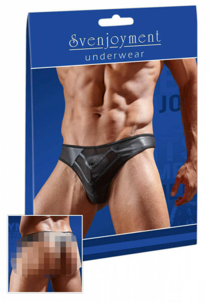 A Svenjoyment szűk, fekete tangája rugalmas, szövettel bevont derékpánttal rendelkezik. Rugalmas anyagok keverékéből készült a nagyon kényelmes viselet érdekében. Az anyagok matt megjelenésűek és nagy háló. Nyomógombokkal a tasakon a kinyitáshoz.