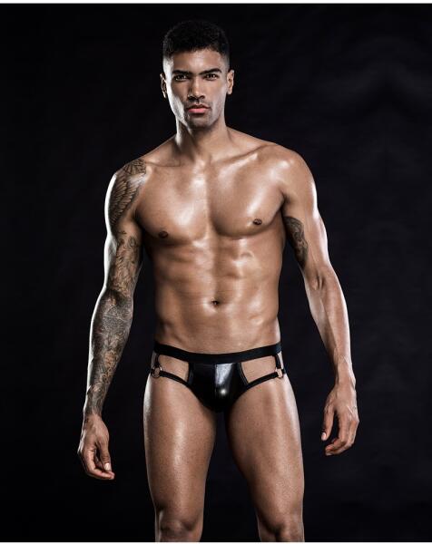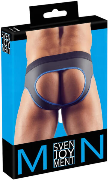 Férfi csillogó fekete Jockstrap No. 7270. Vizes hatású rugalmas anyagból készült. Hátulján nyitott. Gumis pánttal.