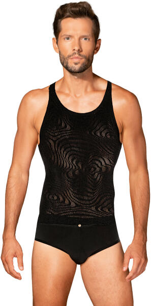 Férfi póló mélyfekete színben. A legmagasabb minőségű, tökéletesen rugalmas anyagból készült, mely kiemeli a férfi testet. A modern, geometrikus minták megragadják a tekintetet, és szexisen mutatnak az alakon. Kényelem és teljes komfort egy olyan változatban, amely biztosan lángra lobbantja az érzékeket!