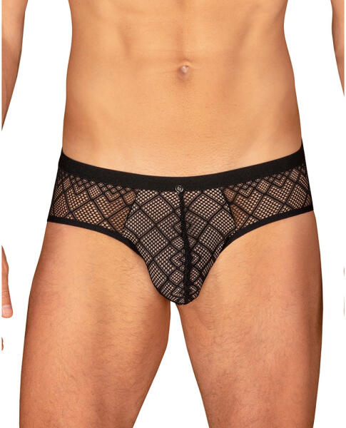 Obsessive Men Severio hátul nyitott férfi alsó Fekete csipkés anyagból készült készült, a fenék résznél erősen nyitott alsó, urak részére. A belsejében egy vékony, sűrű szövésű, halvány sárgás színű hálós bélés található. Gumi derékpántja meglehetősen rugalmas. Méret: L-XL Anyaga: 90% polyamide, 10% elasztán A modell pontos méreteihez tekintse meg a további