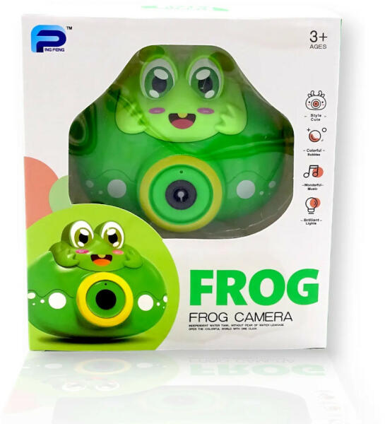 Buborékfújó kamera nyakbaakasztóval béka alakú Buborékfújó kamera nyakbaakasztóval béka alakú. A béka alakú kamerá val szórakoztató lesz a buborékfújás . Akaszd a nyakadba az akasztó segítségével a kamerát, hogy könnyedén magaddal tudd vinni. A buborékfújó hoz 2 db folyadékos tartály tartozik. A színes buborékok fújása közben csodás zene szól a béka alakú b