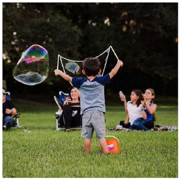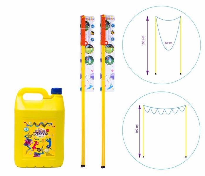 A készletben két nagy, összerakható pálcát találsz, amelyek között kötelek húzódnak – ezekkel a pálcákkal lehet óriási buborékokat varázsolni a csomagban található folyadékból és vízből. Használata egyszerű, tölts vizet egy lavorba vagy nagyobb edénybe, önts bele a folyadékból, majd márts bele a pálcák végén lévő kötelet; ezt követően, a pálcákat lenge
