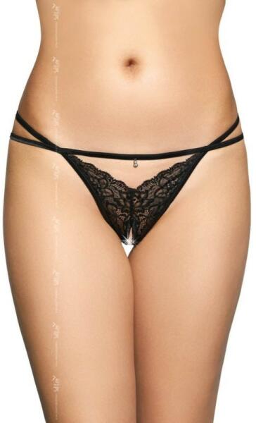 Az ideális csábító! Szebben nem is csomagolhatná nőiességét… Finom kidolgozású, fekete csipkéből készült női tanga, középen nyitott, a szeméremrészt szabadón hagyó sliccel, így tökéletes egy izgalmas és gyors menethez! Anyaga: 100% Polyester.