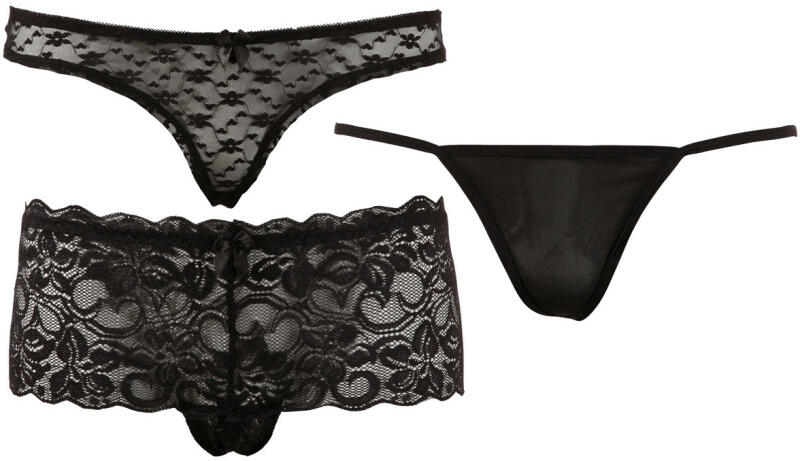 A készlet alul nyitott csipkés bugyit és apró masnival díszített necces tangát tartalmaz. A bugyik virágmintás csipkéből készülnek. Anyag : 94% poliamid, 6% poliészter.
