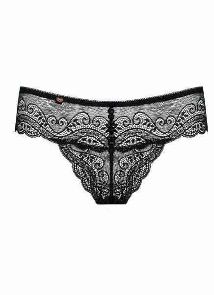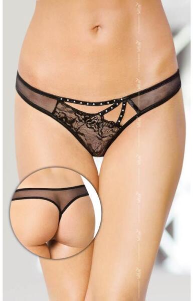 Obsessive Ivannes alsó. Csipke és finom tüll anyag kombinációjából készült, alapvetően áttetsző alsó. felső szegélye készült csipkéből, alatta a finom tüll anyag van jelen, ami az intim résznél szaténos bélést kapott. Hátul az apró nyílás felett szatén masni, és strasszos, fémből készült díszítőelem van. Méret: S-M Anyaga: 90% polyamid, 10% elasztán A méret