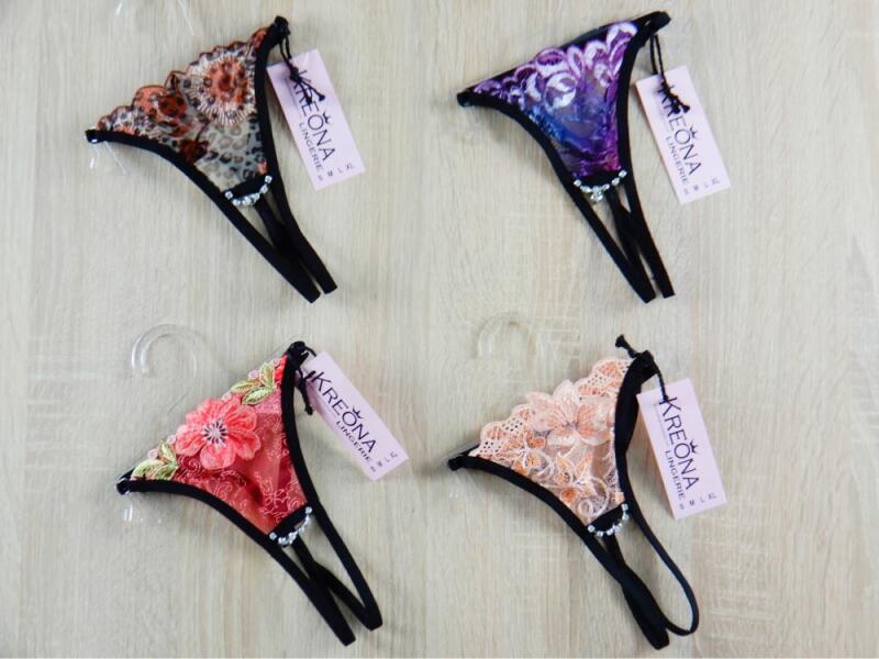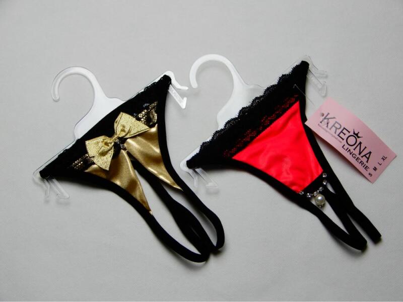 Állítható pántos, méret nélküli elől nyitott tanga, csüngő kis strasszkővel az elején. Áttetsző, necc meg csipkés anyagból készülnek!