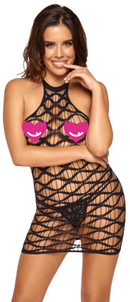 Prémium minőségű, vállpántokkal ellátott, a háton nyitott, rugalmas és áttetsző necc anyagból készült cicaruha. A modell különlegessége, hogy számtalan ovális alakú kivágás található rajta. Harisnyatartós fazonú, alul az intim résznél és fenéktájon nyitott kivitel. Méret: S-L egyenméret Anyaga: 90% nylon, 10% elasztán Prémium minőség, tetszetős csomagolás