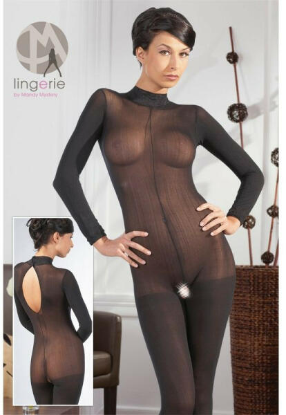 Mandy Mystery enyhén áttetsző cicaruha Hosszú ujjú cicaruha fekete, enyhén áttetsző anyagból, mely a szeméremnél nyitott. Magasan zárt csipkegallérral és patenttal, teljes alakos, lábfejet is borító kivitelbenl. Méret: M-L Anyaga: 100% poliamid