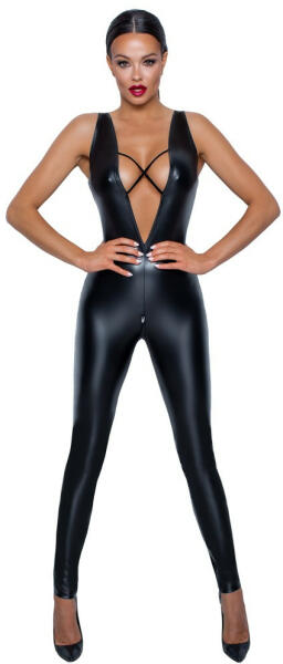 Ujjatlan overál a Noir-tól, amely teljesen rugalmas, gyönyörűen matt és fényes power wet look anyagból készült. Rendkívül szorosan illeszkedik! Elöl és hátul nagyon mélyen dekoltált. Elöl és hátul is dekoratív, rugalmas, cikcakkos bársonypántok találhatóak. Egy praktikus (és erotikus) 2 irányú cipzár található az ágyéknál.