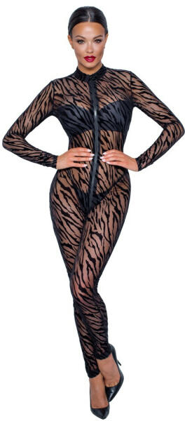 Exkluzív, hosszú ujjú overál a Noir-tól, amely teljes egészében puha és rugalmas powernet-ből készült, finom bársonyból tigrisnyáj mintával. Praktikus, erotikus 3 irányú cipzárja van, amely a nyaktól kezdődik, átmegy az ágyékon és a fenék felett ér véget.