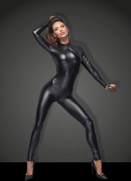 Pimasz powerwetlook overál kétirányú cipzárral az ágyéknál és hosszú cipzárral hátul a könnyű hozzáférés érdekében. Villogó ezüst gyűrűvel a gallérban a szemtelen játékhoz.