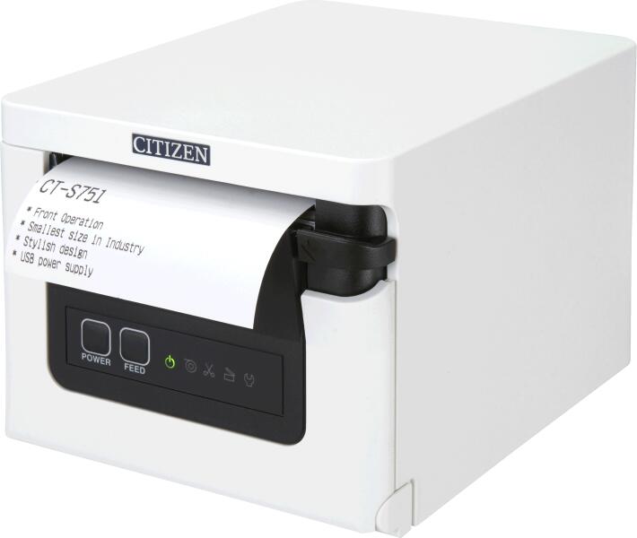 receipt printer, direct thermal, 8 dots/mm (203 dpi), media width (max. ): variable paper width (58/80 mm), print width (max. ): 72 mm, 350 mm/s, USB, cutter, ESC/POS, incl. : power supply unit, receipt roll, QSG, order separately: interface cable, colour: white