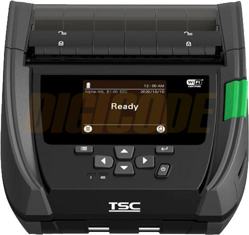 TSC Alpha-40L mobile printer, kereskedelem, ipari, raktár, direct thermal, felbontás: 8 dots/mm (203 dpi), max címke szélesség: 112 mm, max nyomtatási szélesség: 104 mm, max tekercs átmérő: 67mm, max nyomtatási sebesség: 127 mm/s, USB-C, Bluetooth, Wi-Fi (802.11ac), NFC, Micro SD-Slot, real time clock, LCD kijelző, RAM: 128 MB, Flash: 128 MB, csomagban: tápegység, tápkábel (EU),