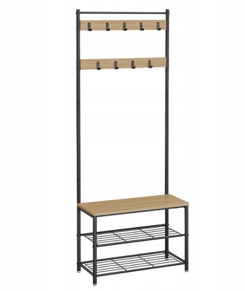 Fém előszoba fal INDUSTRY egy praktikus megoldást kínál robusztus és modern kialakítással az ipari stílus kedvelőinek. A fekete fémszerkezet dub sonoma dekorral kombinálva vonzó kontrasztot hoz létre, amely stílust és eleganciát kölcsönöz az előszobájának. Két sor horog biztosít elegendő helyet a kabátok, táskák vagy kiegészítők felakasztására, így a teret rendez