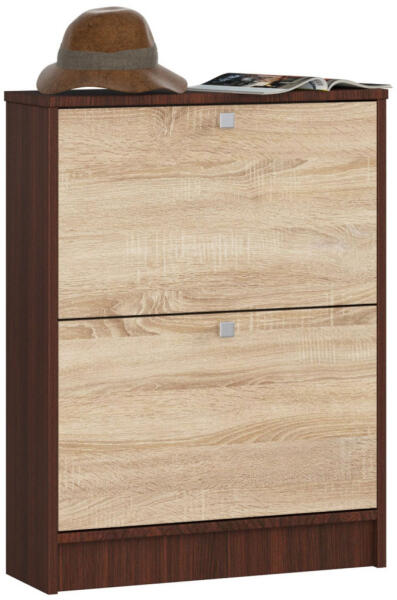Kompakt és stílusos cipősszekrény két billenő ajtóval, amely tökéletes megoldást nyújt 6 pár cipő rendezett tárolására. A wenge test és sonoma tölgy frontok elegáns kombinációja modern megjelenést kölcsönöz otthonának. Elegáns és praktikus cipőtárolási megoldásEz a modern cipősszekrény tökéletes egyensúlyt teremt a funkcionalitás és az esztétikum között. A