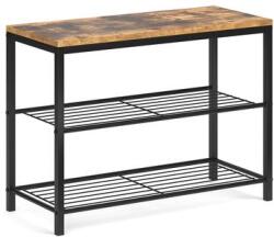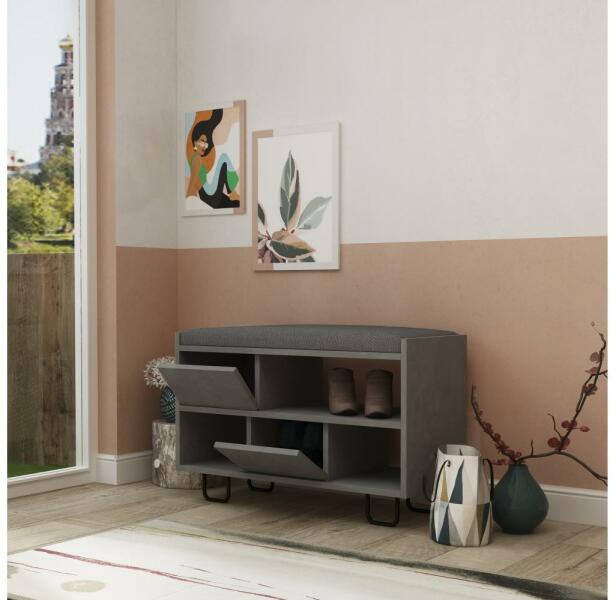 Kényelmes párnázott ülőpárnával ellátott cipősszekrény. Az alja 3 polcból és két szekrényből áll. Laminált forgácslapból készült, lábai fémből készültek. Az anyagvastagság: 1,8 cm. A szekrények méretei: 17 x 30 x 35,5 cm.