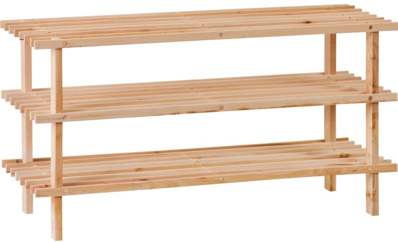 Az OBI fa cipőtartó állvány elegendő helyet biztosít cipői számára, és egyszerű megjelenésével minden előszobába, raktárhelyiségbe, pincébe és garázsba illik. FSC tanúsítvánnyal rendelkező fenyőből készült. Felülete kezeletlen. Praktikus és egyszerű megjelenésű A cipőtartó állvány három egymás fölé helyezett polcával kb. kilenc pár cipő számár nyújt t