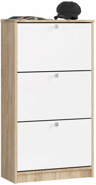Praktikus és stílusos cipősszekrény 3 billenő ajtóval, amely akár 18 pár cipő tárolására alkalmas. A sonoma tölgy és fehér színkombináció modern megjelenést kölcsönöz, tökéletesen illeszkedik bármely előszobába. Maximális tárolókapacitás kompakt kivitelben Ez a modern cipősszekrény tökéletes megoldást kínál a cipők rendezett tárolására. A 60 cm széles bú
