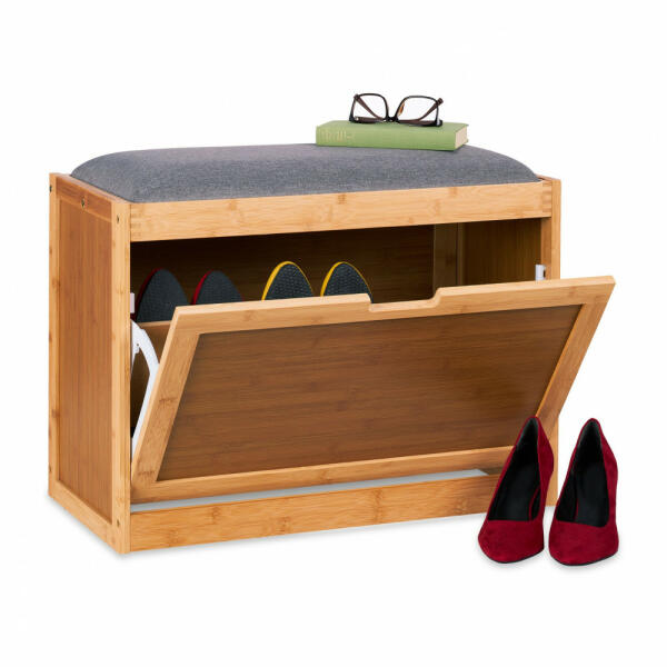A nagy előszoba padnak köszönhetően a cipő levétele még egyszerűbb. Üljön le a kárpitozott ülésre elegáns, és kényelmesen csúsztassa le cipőjét. Ezután elrakhatja őket a billenthető cipőtartó rekeszekben. A cipőtartó 2 állítható rekesszel rendelkezik, így kicsit magasabb cipőknek is van hely. A padban összesen 6 pár fér el. A bambusz gyártásának köszönhetően