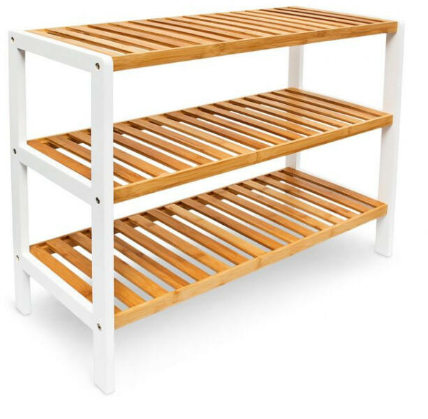 Bambusz-fehér 3 polcos cipőtartó 54,5x70x24,5 cm Stílusos cipőtartó bambuszból, fehér oldalpanelekkel, 9 pár cipőhöz. Három polcos, könnyen tisztítható, nedves ruhával. Teljes méretek: 54,5 x 70 x 24,5 cm Polcok közötti távolság: 18,5 cm Erős bambuszból készült