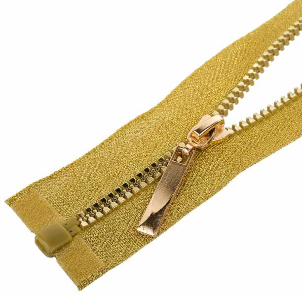 Nagyon esztétikus, polírozott műanyag fogazattal rendelkező cipzár. A különleges fogazat 3 mm széles, a hordozószalag csillogó ezüst vagy arany színű, teljes szélessége 3 cm. Attraktív cipzár, így a legnagyobb esztétikai elvárásoknak is megfelel. Nyitható, vagy más néven bontható kivitel, alkalmazható például pulóver, dzseki, kabát, blézer készítésénél. Hossz: 6