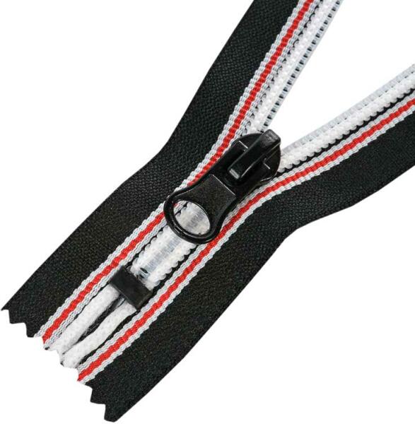 Műanyag spirállal rendelkező nem bontható cipzár (zárt). A spirál szélessége 5 mm, a cipzárszalag teljes szélessége 3 cm. A műanyag spirál színe fehér, a fekete textilszalagot fehér és piros csík díszíti. A cipzárkocsi fekete színű. A cipzárszalag színét egy színkód jelzi, így könnyen választhat ugyanolyan színkóddal rendelkező egyéb terméket, például cérná