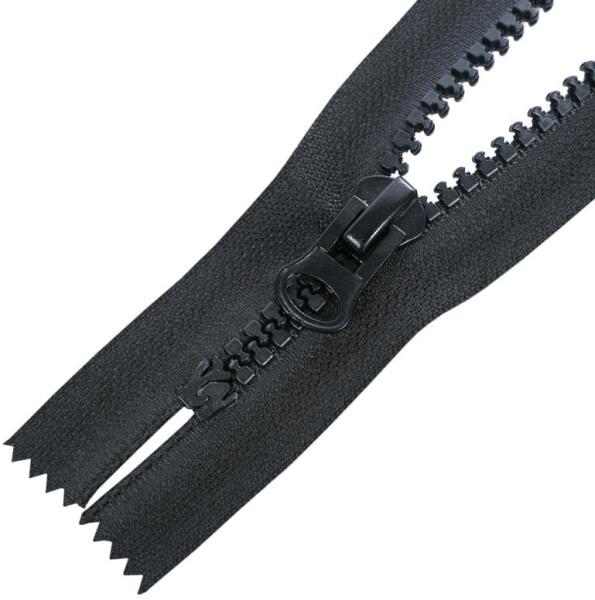 Vastag és erős öntött műanyag fogazattal rendelkező nem bontható (zárt) cipzár. Ezt a típusú cipzárt hívják cápafogú, vagy farkasfogú cipzárnak is. A fogazat szélessége 8 mm (GT20), a cipzárszalag teljes szélessége 3,7 cm. A fogazat, a textilszalag és a kocsi is fekete színű. A cipzár színét egy színkód jelzi, ezért könnyen választhat ugyanolyan színű egyéb ter