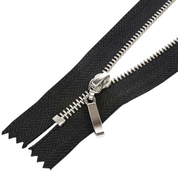 Ezüst színű, fém fogazattal rendelkező cipzár, dekoratív cipzárkocsival. Zárt kivitel, tehát nem bontható a cipzár alja. A fogazat szélessége 3 mm, a textilszalag 3 cm széles. A fém fogazattal rendelkező cipzárok nagyobb mechanikai igénybevétel esetén is használhatóak. A króm felületet nagy tartósság és a légköri tényezőkkel szembeni nagy ellenállás jellemzi, teh