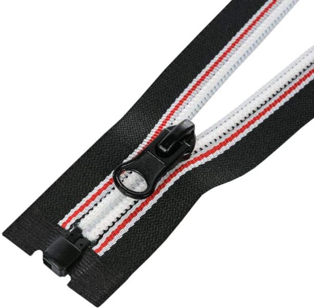 Műanyag spirállal rendelkező bontható cipzár. A spirál szélessége 5 mm, a cipzárszalag teljes szélessége 3 cm. A műanyag spirál színe fehér, a fekete textilszalagot fehér és piros csík díszíti. A cipzárkocsi fekete színű. A cipzárszalag színét egy színkód jelzi, így könnyen választhat ugyanolyan színkóddal rendelkező egyéb terméket, például cérnát, a megfele