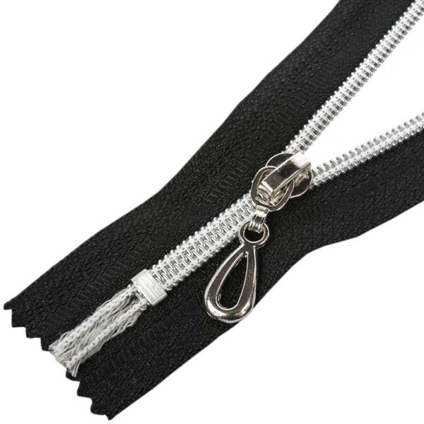 Ezüst színű műanyag spirállal rendelkező dekoratív cipzár, zárt, vagy más néven nem bontható kivitelben. Ez egy nagyon népszerű cipzártípus, esztétikus dizájnt tudsz kialakítani a munka során. A cipzárkocsi nagyon dekoratív, és autolock funkcióval van ellátva, így nem tud kinyílni a cipzár véletlenül. A spirál szélessége 5 mm, a cipzárszalag teljes szélessége 3