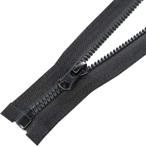 Fekete műanyag fogazattal rendelkező cápafogú cipzár. Az esztétikus fogazat 3 mm széles, a hordozószalag teljes szélessége 3 cm. A cipzárszalag, a fogazat és a cipzárkocsi színe megegyezik, így bedolgozás után nagyon dekoratív. Nyitható, vagy más néven "bontható" kivitel, alkalmazható például pulóver, dzseki, kabát, blézer, munkaruházati készítésénél. A cipzársza