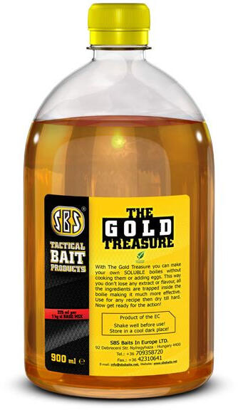 Az SBS Gold Treasure egy olyan különleges adalékanyag, ami által bárki elkészítheti egyedi, igazán fogós oldódó bojliját. Ezentúl a népszerű 225 ml-es kiszerelés mellett egy új, 1 literes gazdaságos kiszerelés is elérhetővé vált a Gold Treasure-t előszeretettel használók számára. Az egy literes kiszerelés azok kedvéért vált elérhetővé, akik egyszerre nagyobb menn