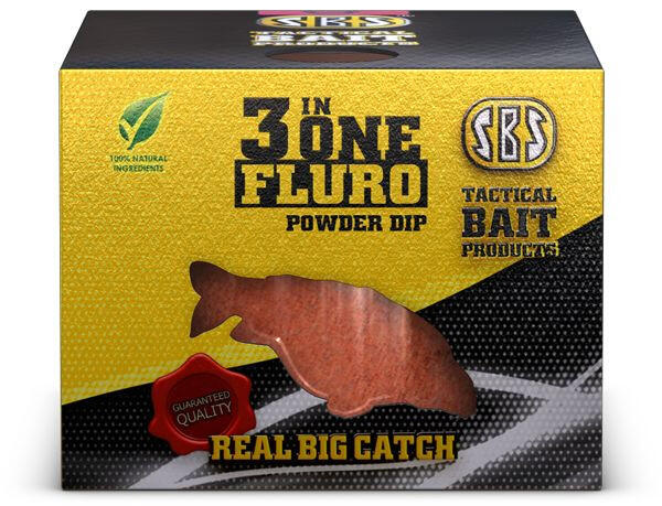 SBS 3 in One Fluro Powder Dip A doboz alsó részében 150 gr rendkívül vonzó illattal és ízesítéssel rendelkező pordip található, amely vízbe érkezést követően rövid idő alatt leoldódik csalink felületéről. A felső részben a rendkívül élénk színű fluro por található, amiből 25 gramm van a dobozban. A fluro por is rendelkezik ízesítéssel, viszont csalinkról nem