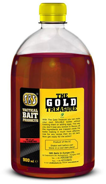 Az SBS Gold Treasure egy olyan különleges adalékanyag, ami által bárki elkészítheti egyedi, igazán fogós oldódó bojliját. Ezentúl a népszerű 225 ml-es kiszerelés mellett egy új, 1 literes gazdaságos kiszerelés is elérhetővé vált a Gold Treasure-t előszeretettel használók számára. Az egy literes kiszerelés azok kedvéért vált elérhetővé, akik egyszerre nagyobb menn