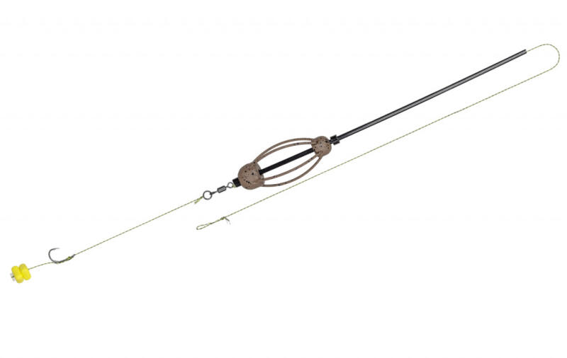 Terepszínű, gubancgátló csöves etetőkosárral, nagy szakítószilárdságú fonott zsinórral, gumikukoricával kibalanszírozott, extrahegyes minőségi horoggal ellátott készre szerelt végszerelék, mely a zsinórra akasztás után azonnal bevethető. A kosár alatt található forgóban a horogelőke tetszőlegesen cserélhető. A gumikukorica önmagában is használható, de aromatiz
