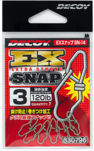 Decoy SN-14 EX Extra Strong Snap kapocsA nagy szilárdságú, kiváló minőségű SUS-huzal V-alakban van körbetekerve, és a vége köré pluszban, így rendkívül tartós pattintással rendelkezik, amelyet úgy terveztek, hogy túlzott erő alkalmazásakor megnyúljon, elkerülve a legrosszabb forgatókönyvet, amikor kihúzódik vagy eltörik egy kapocs. Ideális különféle tengeri célpon