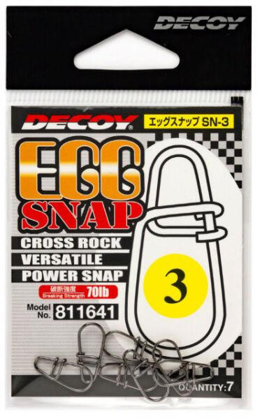 Gyártó: Decoy Modell: Egg Snap SN-3 Méret: #4 Teherbírás: 90Lb (40,8 kg) Szín: fekete Kiszerelés: 7 db/csomag Származási hely: Japán A DECOY SN-3 EGG SNAP egy kiváló minőségű japán horgász kiegészítő, ami széles körben alkalmazható a horgászat szinte minden területén. A termék kifejezetten a pergető horgászok igényeihez lett tervezve. A DECOY EGG SNAP egy olyan speci