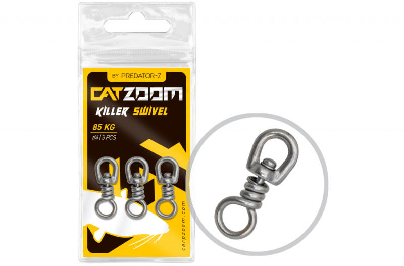Predator Z Catzoom Killer harcsázó forgó 3db/csomag Méret: 4#-36,5 mm-80 kg Európa legnagyobb édesvízi halának eredményes horgászatához extrém módon terhelhető felszerelés szükségeltetik. Minden egyes elemnek kifogástalannak kell lennie, mert a leggyengébb láncszem bizony halvesztést eredményezet. Ebben a szellemben született ez a már kinézetében is erőt sugárzó harcs