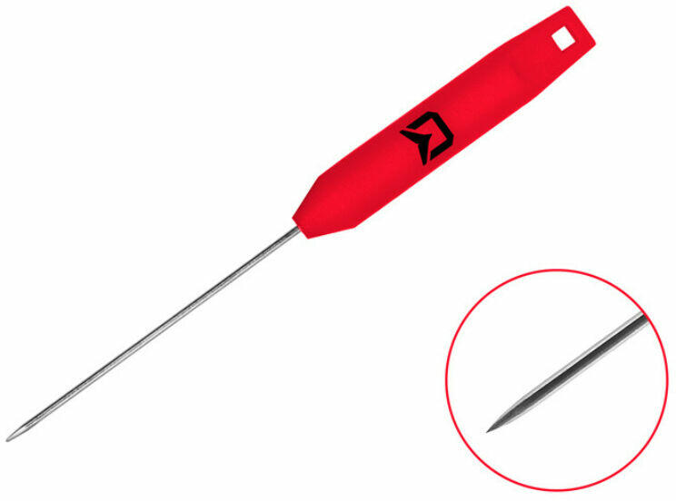 A Delphin SLIM QuickSTOP egy vékony feeder fűzőtű elsősorban quickstop ütköző használatakor. A vékony hegyes fém rész és horog segítségével apró csalikat is fel tud fűzni. A 40mm hosszú fém rész a minimális átmérője ellen elegendően erős és rugalmas. A piros műanyag fogó része fekete logóval kényelmes használatot biztosít. A színének köszönhetően mindig jól