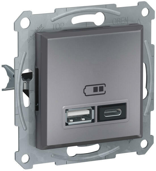 ASFORA Dupla USB töltő, 2.4A, A+C, acél EPH2700362 Schneider Schneider Electric Asfora USB töltő EPH2700362 színes acélból egy rögzítő kerettel rendelkező mechanizmus 2 kivezetéssel. Az USB 2.0 porttal a lehető legkényelmesebbé teszi a mobil/táblagép napi töltését. Áramfelvétele 0,075 W. Ezen kívül ennek a készüléknek a névleges üzemi feszültsége 100... 240V. Ennek