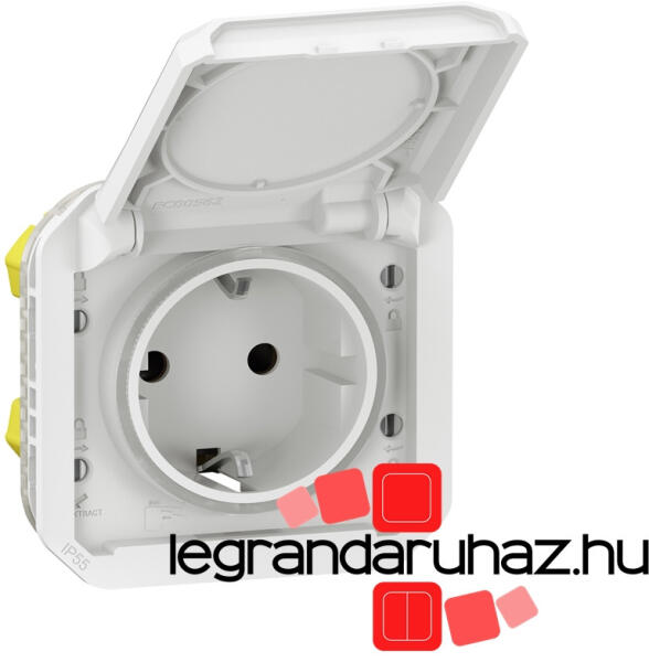 Plexo 55 - konnektor burkolattal Plexo 55 mechanizmus burkolattal Nem összeszerelt változat Földelt csatlakozóaljzat 16 A - 250 V~ Rugós vezetékbekötés 2P+F csatlakozóaljzat biztonsági zsaluval Falon kívüli szereléshez kiemelődoboz, süllyesztett szereléshez keret szükséges Plexo 55 fehér Csatlakozás: Rugós vezetékbekötés Kábel csupaszítási hossz: 12 mm Vezetékméret: ma
