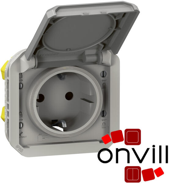 Plexo 55 - konnektor burkolattal Plexo 55 mechanizmus burkolattal Nem összeszerelt változat Földelt csatlakozóaljzat 16 A - 250 V~ Rugós vezetékbekötés 2P+F csatlakozóaljzat biztonsági zsaluval Falon kívüli szereléshez kiemelődoboz, süllyesztett szereléshez keret szükséges Plexo 55 szürke Csatlakozás: Rugós vezetékbekötés Kábel csupaszítási hossz: 12 mm Vezetékméret: m