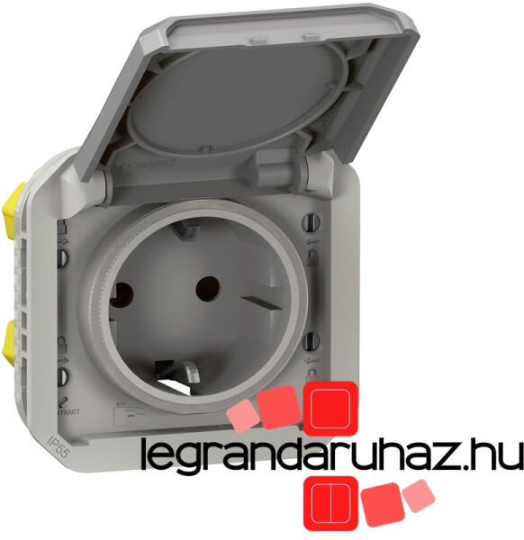 Plexo 55 - konnektor burkolattal Plexo 55 mechanizmus burkolattal Nem összeszerelt változat Földelt csatlakozóaljzat 16 A - 250 V~ Rugós vezetékbekötés 2P+F csatlakozóaljzat biztonsági zsaluval Falon kívüli szereléshez kiemelődoboz, süllyesztett szereléshez keret szükséges Plexo 55 szürke Csatlakozás: Rugós vezetékbekötés Kábel csupaszítási hossz: 12 mm Vezetékméret: m