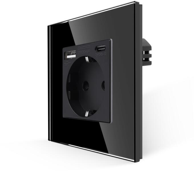 Az üvegkeretben található LUXION egyszerű aljzat egy egyszerű aljzatból és 2 USB-A és USB-C aljzatból áll. A LUXION aljzatok kompakt, elegáns és minimalista kialakításukkal tűnnek ki. Sokoldalúak, védik a gyerekeket, és a legújabb generációs technológia az energiatakarékosságot támogatja. A szerkezet strapabíró, a foglalatok idővel nem színeződnek el. Minőségi és t
